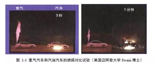 通常情況下,氫的密度僅為空氣的7%(一個(gè)標(biāo)準(zhǔn)大氣壓下,0℃下,密度為0.0899g/L),與汽油、丙烷和天然氣相比,具有更大的浮力(快速上升)、擴(kuò)散性(橫向移動(dòng))和快速揮發(fā)性??諝庵泻茈y聚集高濃度的氫,如果發(fā)生泄漏,氫氣會(huì)迅速擴(kuò)散,特別是在開放環(huán)境中,很容易快速逃逸,而不像汽油揮發(fā)后滯留在空氣中不易疏散。美國(guó)邁阿密大學(xué)的Swain博士做過(guò)一個(gè)著名的試驗(yàn),如圖1-1所示。兩輛汽車分別用氫氣和汽油作燃料,然后進(jìn)行泄漏點(diǎn)火試驗(yàn)。點(diǎn)火3秒后,高壓氫氣產(chǎn)生的火焰直噴上方,汽油則從汽車的下部著火;到1分鐘時(shí),用氫氣作燃料的汽車只有漏出的氫氣在燃燒,汽車沒有大問(wèn)題,而汽油車則早已成為大火球,完全燒光。所以氫氣易揮發(fā)的性質(zhì),與普通汽油車相比,有利于汽車的安全。