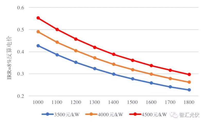 按照2.5分/kWh的運(yùn)維成本,若項(xiàng)目達(dá)到8%的收益率,不同發(fā)電小時(shí)數(shù)的反算電價(jià)如下圖所示。