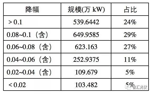 從項(xiàng)目的投標(biāo)電價(jià)來看,雖然有極個(gè)別業(yè)主,電價(jià)降幅達(dá)到0.193元/kWh,但根據(jù)統(tǒng)計(jì),不同降價(jià)幅度的項(xiàng)目規(guī)模如下表所示.