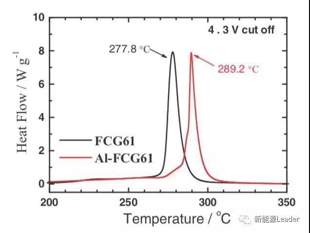 在提升NCM材料循環(huán)穩(wěn)定性的同時(shí),Al摻雜還改善了NCM材料的熱穩(wěn)定性。從下圖我們能夠看到FCG61材料的熱分解溫度為278℃左右,熱分解釋放熱量為1070J/g,而經(jīng)過Al摻雜后熱分解溫度提高到了290℃,熱分解放熱量也降低到了889J/g,對(duì)于提升鋰離子電池的安全性具有重要的意義。