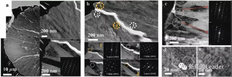 下圖為Al-FCG61材料在經(jīng)過3000次循環(huán)后的顆粒結(jié)構(gòu),從圖中能夠看到經(jīng)過長(zhǎng)期循環(huán)后在顆粒內(nèi)部沿著晶界產(chǎn)生了一些裂紋,從顆粒的表面一直延伸到顆粒的中心位置,對(duì)裂紋兩側(cè)的晶粒進(jìn)行分析發(fā)現(xiàn)存在兩種晶體結(jié)構(gòu),分別是下圖b中1和4位置的層狀結(jié)構(gòu),2和3位置的巖鹽結(jié)構(gòu),同時(shí)存在兩種不同晶體結(jié)構(gòu)導(dǎo)致了顆粒內(nèi)部應(yīng)變不均,進(jìn)一步促進(jìn)了裂紋的生長(zhǎng)。
