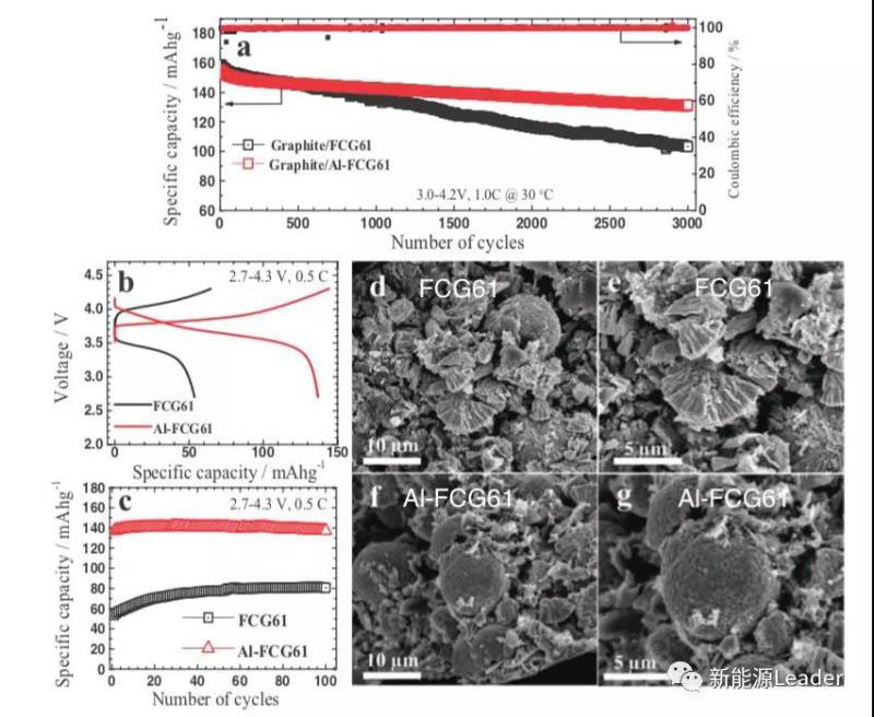 我們知道對(duì)于NCM材料而言,Ni的含量越高則材料的容量越高,而材料的穩(wěn)定性也會(huì)越差,材料的循環(huán)性能也會(huì)相應(yīng)下降。為了在保證材料的高容量的同時(shí),又能夠保持良好的循環(huán)穩(wěn)定性,因此作者合成了具有梯度濃度分布的Li[Ni0.61Co0.12Mn0.27]O2材料(FCG61),并向其中加入了0.75mol%的Al元素(Li[Ni0.600Co0.121Mn0.272Al0.007]O2, Al-FCG61),以進(jìn)一步提升材料的循環(huán)性能。