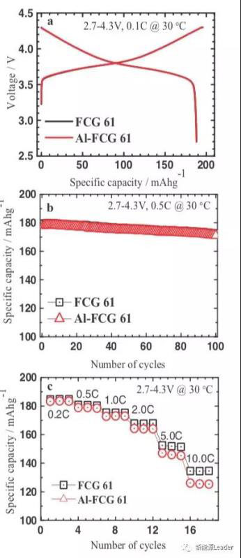 下圖a為FCG61(梯度濃度NCM)材料和Al-FCG61(Al摻雜梯度濃度NCM)材料的扣電容量測(cè)試結(jié)果,可以看到兩種材料的容量發(fā)揮都在188mAh/g左右,并且兩種材料在扣式電池中的循環(huán)數(shù)據(jù)也非常接近(100次循環(huán)96.3%),倍率性能上FCG61材料要比Al-FCG61材料略好一些,特別是較高的倍率(5C和10C)下FCG61材料的容量發(fā)揮要明顯好于Al摻雜的Al-FCG61材料,表明Al摻雜會(huì)對(duì)材料的倍率性能產(chǎn)生一定的影響。