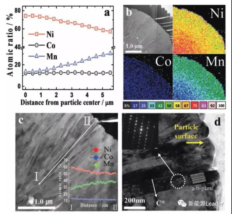 下圖a為梯度濃度材料中過渡金屬元素Ni、Co和Mn元素在顆粒直徑方向的濃度分布,能夠看到顆粒中心位置的Ni元素的含量為75%,在顆粒的表面Ni元素的濃度降低到了57%。而Mn元素的濃度則從中心位置的14%逐漸提高到顆粒表面的30%,而Co元素的濃度則幾乎沒有發(fā)生顯著的改變。從下圖b的EDS圖片中我們也能夠看到,Ni元素的分布明顯呈現(xiàn)中心濃度大,表面濃度低的狀態(tài),Mn元素則正好相反,中心濃度低,表面濃度高,而Co元素則在顆粒內(nèi)部分布比較均勻。