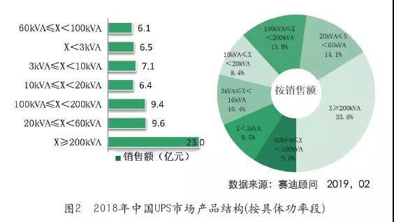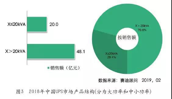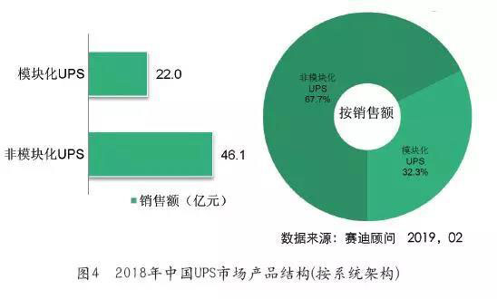 根據(jù)賽迪顧問(wèn)統(tǒng)計(jì),2018年中國(guó)中小功率UPS整體市場(chǎng)銷售額為20億元人民幣,較2017年下降了5.36%;2018年中國(guó)大功率UPS整體市場(chǎng)銷售額為48.1億元人民幣,與2017年相比獲得快速增長(zhǎng),同比增長(zhǎng)18.6%。從系統(tǒng)架構(gòu)來(lái)看,2018年模塊化UPS保持快速增長(zhǎng),占比進(jìn)一步增加,規(guī)模為22億元,與2017年相比增長(zhǎng)24.9%,份額達(dá)到整體UPS市場(chǎng)的32.3%。