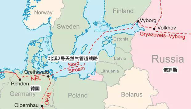 北溪2號(hào)天然氣管道線路圖(來(lái)源:自維基百科)