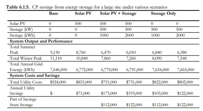 在演示的一個(gè)模型中,相對(duì)于“重疊峰值”(CP)定價(jià),從太陽(yáng)能發(fā)電設(shè)施,太陽(yáng)能+儲(chǔ)能、獨(dú)立部署儲(chǔ)能系統(tǒng)的各種配置中展示了其節(jié)省的成本。例如一個(gè)裝機(jī)容量為500kW的太陽(yáng)能發(fā)電設(shè)施和一個(gè)500kW/2MWh儲(chǔ)能系統(tǒng)每年節(jié)省電力費(fèi)用為193,000美元。