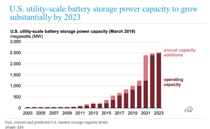 但這一數(shù)字即將發(fā)生巨大變化,因為美國能源部能源信息管理局(EIA)已發(fā)布一份報告,預(yù)計到2023年電池儲能系統(tǒng)的裝機容量將增加一倍以上,將達到2.5GW。
