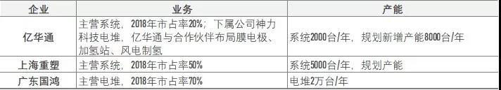億華通、上海重塑主營以系統(tǒng)為主,2018年市占率分別達到20%、50%,為國內(nèi)系統(tǒng)環(huán)節(jié)第一梯隊。廣東國鴻主營燃料電池電堆,2018年市占率高達70%,目前公司年產(chǎn)能達到2萬臺。
