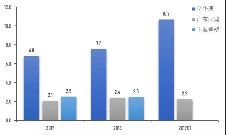 資產(chǎn)角度看,三家均處穩(wěn)步擴張過程:1)億華通:資產(chǎn)規(guī)模持續(xù)擴張,2018年底,億華通總資產(chǎn)達到12億,凈資產(chǎn)7.5億。2)廣東國鴻:2017~2019Q1,國鴻總資產(chǎn)分別為8.8、10.7、10.4億,公司資產(chǎn)負(fù)債率相對較高,2019年Q1達到78.5%。3)上海重塑:2018年重塑總資產(chǎn)增至7.1億,資產(chǎn)負(fù)債率達到65.5%。明顯可以看到依托資本市場的優(yōu)勢。