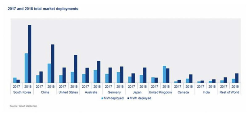 Wood Mackenzie公司指出,中國政府在儲能領(lǐng)域的積極政策激勵是促進該行業(yè)快速增長的主要原因,也是儲能部署的主要推動力。中國2018年部署的儲能容量為580MW/1.14GWh,儲能市場規(guī)模累計達到1.07GW/1.98GWh,并且已經(jīng)確立其在亞太地區(qū)第二大儲能市場的地位。而在儲能部署方面,韓國在亞太地區(qū)仍名列首位。Wood Mackenzie公司對于中國2018年儲能市場增長進行的評論說,“中國電網(wǎng)側(cè)(FTM)儲能部署大幅增長,與2017年相比,2018年裝機容量增長了五倍?!?