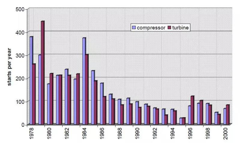 圖3給出了德國漢特福儲能電站的壓縮機組及膨脹機組每年的啟動次數(shù)。在投運之初,該儲能電站主要充當(dāng)緊急備用電源角色,當(dāng)電網(wǎng)內(nèi)其他電源出現(xiàn)故障時,向電網(wǎng)提供有功輸出支持,機組的平均啟動可靠性為97.6%,截止目前該儲能電站仍在運營[19, 20]。在1978年首次投用時,儲能電站的壓縮機組就啟動將近400次,膨脹發(fā)電機組啟動次數(shù)也超過250次;到1979年,膨脹發(fā)電機組啟動次數(shù)達到了450次左右。自1985年之后,漢特福壓縮空氣儲能電站所在的電網(wǎng)接入了大容量的抽水蓄能電站,電網(wǎng)減少了對壓縮空氣儲能電站的調(diào)用頻次。