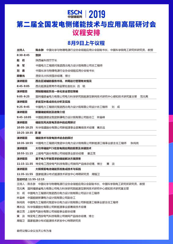 中國儲能網(wǎng)訊:為進一步推進儲能在發(fā)電側(cè)上的項目規(guī)劃、安全施工、系統(tǒng)集成技術(shù)應用、運營模式、電網(wǎng)接入、標準體系、風光儲電站考核機制、調(diào)度模式、儲能項目備案、審批流程和市場環(huán)境等方面展開深入討論,中國化學與物理電源行業(yè)協(xié)會儲能應用分會聯(lián)合全國微電網(wǎng)與分布式電源并網(wǎng)標準化技術(shù)委員會、中國電力工程顧問集團西北電力設(shè)計院有限公司、西安北大科技園、中國科學院電工研究所儲能技術(shù)組、深圳市科陸電子科技股份有限公司等單位聯(lián)合主辦“第二屆全國發(fā)電側(cè)儲能技術(shù)與應用高層研討會”,現(xiàn)將有關(guān)議程通知如下: