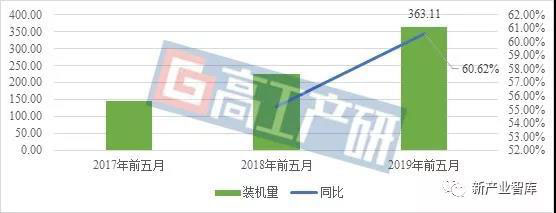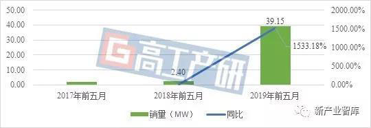 根據(jù)高工產(chǎn)研氫電研究所(GGII)數(shù)據(jù),2019年1~5月中國車用氫燃料電池共裝機39.15MW,同比增長1533.18%。