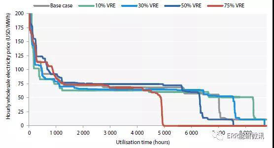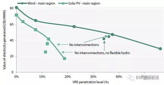最后,作為風(fēng)速或太陽輻射等自然資源可用性的函數(shù),VRE的發(fā)電量不僅比可調(diào)度電廠的發(fā)電量變化更大,而且在有限的幾個(gè)小時(shí)內(nèi)更集中。高發(fā)電周期之后是低或零發(fā)電周期。因?yàn)樗麄兌紤?yīng)對(duì)同樣的氣象條件,風(fēng)力渦輪機(jī)和光伏發(fā)電廠往往會(huì)自動(dòng)關(guān)聯(lián),即產(chǎn)生不均衡地更多電力;當(dāng)其他電廠同時(shí)的生成和產(chǎn)生更少當(dāng)其他風(fēng)能和太陽能光伏發(fā)電廠也運(yùn)行在較低的利用率。再加上VRE資源的短期邊際成本為零,這使得VRE發(fā)電的平均價(jià)格隨著滲透水平的增加而下降,這種現(xiàn)象通常稱為自相蠶食。圖48總結(jié)了這一影響,顯示了風(fēng)電和太陽能光伏發(fā)電機(jī)組在批發(fā)電力市場(chǎng)上的平均市場(chǎng)價(jià)格,作為它們?cè)陔娏M合中所占份額的函數(shù)。