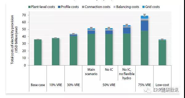 在電力結(jié)構(gòu)中,VRE占比10%時(shí),只比只有傳統(tǒng)可調(diào)度發(fā)電機(jī)的參考系統(tǒng)的成本高出約5%,而在中等規(guī)模的系統(tǒng)中,對(duì)應(yīng)的額外成本約為20億美元/年。VRE占比30%時(shí),成本每年增加約80億美元,即相對(duì)于基本情況增加21%。實(shí)現(xiàn)更具雄心的VRE目標(biāo)將導(dǎo)致更高的成本。如果50%的電力生產(chǎn)是由可再生能源提供的,那么每年的總成本將增加150億美元以上,與基本情況相比,這將增加42%的成本。達(dá)到75%的VRE目標(biāo)意味著最終的電力供應(yīng)成本幾乎翻倍,達(dá)到每年近700億美元,比基本情況高出330多億美元。