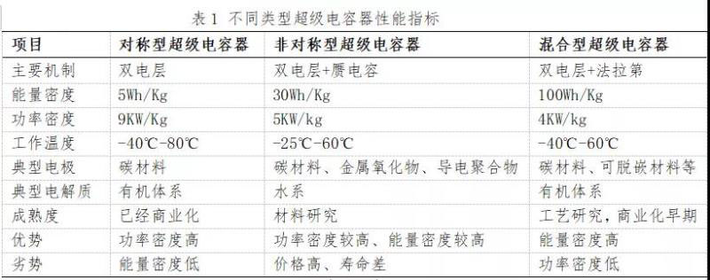 按照儲(chǔ)能機(jī)理不同,可以將超級(jí)電容器分為對(duì)稱性超級(jí)電容器、非對(duì)稱性超級(jí)電容器和混合型超級(jí)電容器,三類超級(jí)電容器性能見表1。