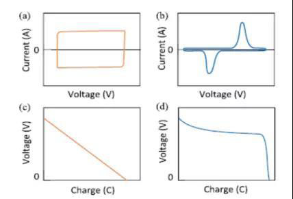 用于超級(jí)電容器電極和電解液制造生產(chǎn)的材料較多,為了深入的理解超級(jí)電容器能量存儲(chǔ)機(jī)制,并對(duì)超級(jí)電容器的性能進(jìn)行優(yōu)化,通常需要利用循環(huán)伏安曲線和恒流放電兩種實(shí)驗(yàn)來(lái)表征不同超級(jí)電容器電極性能。圖2給出了不同能量存儲(chǔ)機(jī)制下,超級(jí)電容器電極循環(huán)伏安及恒流放電曲線,其中a、c分別表示雙電層電容、贗電容儲(chǔ)存機(jī)制下,超級(jí)電容器電極的循環(huán)伏安曲線及恒流放電曲線;b、d分別表示法拉第電容儲(chǔ)存機(jī)制下,超級(jí)電容器電極的循環(huán)伏安曲線及恒流放電曲線。