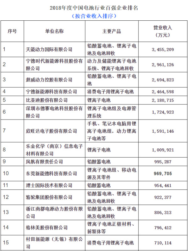 中國(guó)儲(chǔ)能網(wǎng)訊:2019年7月29日,中國(guó)化學(xué)與物理電源行業(yè)協(xié)會(huì)根據(jù)企業(yè)申報(bào)數(shù)據(jù)和上市公司年報(bào)數(shù)據(jù),經(jīng)審核評(píng)定發(fā)布了“2018年度中國(guó)電池行業(yè)百?gòu)?qiáng)企業(yè)名單”。天能動(dòng)力國(guó)際有限公司以345.52億元再次蟬聯(lián)中國(guó)電池行業(yè)百?gòu)?qiáng)企業(yè)第一,同比增長(zhǎng)28.4%。寧德時(shí)代新能源科技股份有限公司以296.11億元位居第二,同比增長(zhǎng)48.1%。超威動(dòng)力控股有限公司以269.48億元排名第三,同比增長(zhǎng)9.3%。寧德新能源科技有限公司和比亞迪股份有限公司分別以246.65億元和218.07億元位居第四和第五,分別增長(zhǎng)32.7%和45.5%。