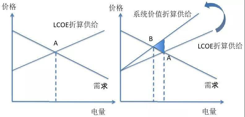 從供需角度來看,僅將發(fā)電側(cè)LCOE拿來與其他電源比較,風(fēng)電光伏項(xiàng)目仿佛將在A點(diǎn)已經(jīng)具有競爭力,但實(shí)際上,疊加調(diào)峰成本后,風(fēng)電項(xiàng)目真實(shí)度電成本在在B點(diǎn)。AB兩點(diǎn)之間的差額目前沒有得到良好的測算和預(yù)期,是投資決策時點(diǎn)的巨大盲點(diǎn)。