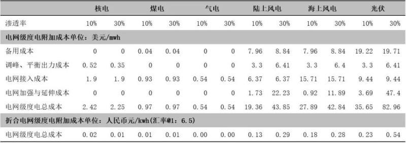 基于當(dāng)時的技術(shù)水平和裝機(jī)容量,OECD/NEA以2012年的德國電力系統(tǒng)為例,對各項(xiàng)技術(shù)在不同滲透率的情況下、電網(wǎng)級別需要額外考慮的成本進(jìn)行了估計(jì)。從分析可知,核、煤、氣等具有良好調(diào)峰性能和規(guī)模效應(yīng)的電源附加成本較低;而風(fēng)電光伏等電源由于間歇性特征對調(diào)峰、備用和電網(wǎng)建設(shè)等的需求較大,在10%滲透率下,需每度電額外考慮0.1-0.2元/kwh的成本,如滲透率為30%,電網(wǎng)側(cè)附加成本還要更高。