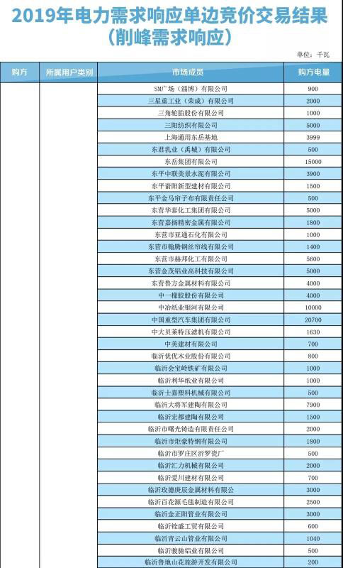 山東電力交易中心于7月22日-23日組織開展了山東省2019年電力需求響應(yīng)單邊競價交易,按照《關(guān)于開展2019年電力需求響應(yīng)工作的通知》(魯能源電力字〔2019〕176號)和《2019年電力需求響應(yīng)單邊競價交易公告》(通知〔2019〕131號)有關(guān)要求,國網(wǎng)山東省電力公司根據(jù)響應(yīng)方在山東省電力需求側(cè)管理平臺申報情況對響應(yīng)負(fù)荷進行了校核,確認(rèn)555家電力用戶達成削峰需求響應(yīng)2103952千瓦,統(tǒng)一出清價格30元/千瓦;257家電力用戶達成填谷需求響應(yīng)827371千瓦,統(tǒng)一出清價格30元/千瓦?,F(xiàn)將2019年電力需求響應(yīng)單邊競價交易結(jié)果(詳見下表)予以發(fā)布。