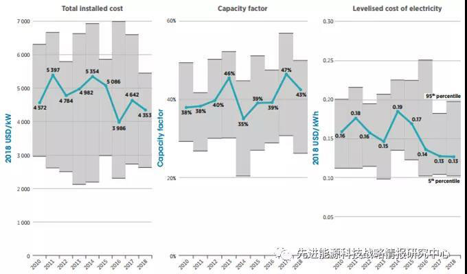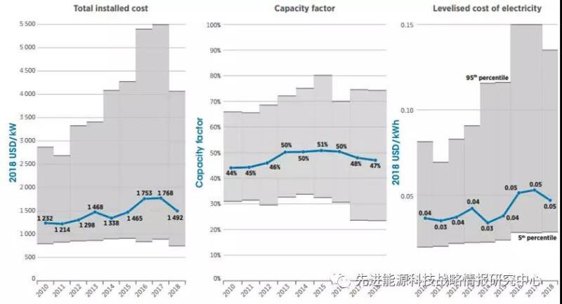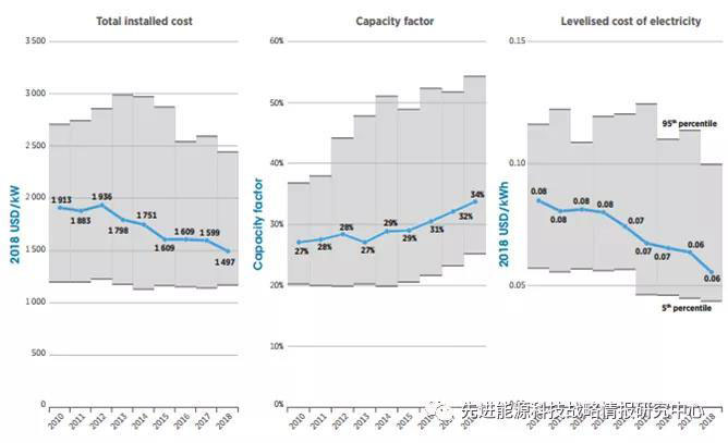 圖2 2010-2018年間CSP全球加權(quán)平均裝機(jī)成本(單位:美元/千瓦)、容量因子和LCOE(單位:美元/千瓦時(shí))變化態(tài)勢