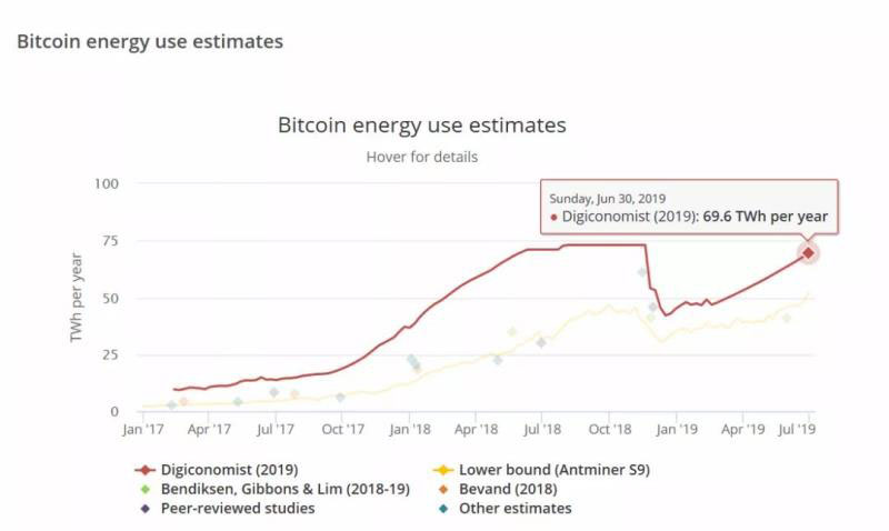 比特幣的價格上漲,特別是在2017年12月達到歷史最高水平時,推動了哈希值和難度的大幅增加,以及更強大和更節(jié)能的采礦硬件的開發(fā)和部署。最近發(fā)表的比特幣電力消耗估計值范圍很廣,每年200億—800億千瓦時之間,約占全球用電量的0.1-0.3%。