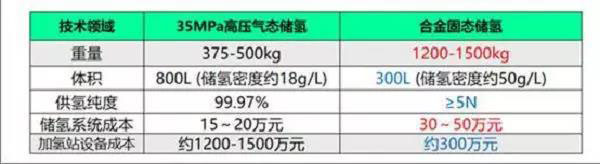 下圖是研發(fā)方給出的低壓固態(tài)儲氫技術(shù)(合金固態(tài)儲氫)與國內(nèi)主流的35MPa高壓儲氫的數(shù)據(jù)對比。從圖中可以看出,低壓儲氫的優(yōu)勢主要在于需要的儲氫設(shè)備的體積小,加氫站設(shè)備成本低。但劣勢在于儲氫罐重量大,儲氫系統(tǒng)成本高。