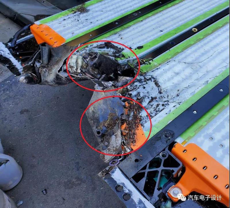 在事故中等于最惡劣的情況,底盤前面的部分沒有防護(hù)好,正面有物理直接往電池系統(tǒng)前方切開前面的保護(hù),讓前部的電芯受到了直接的力,整個(gè)電池系統(tǒng)的結(jié)構(gòu)防護(hù)給破壞,物理直接對(duì)著電芯就施加了擠壓力。