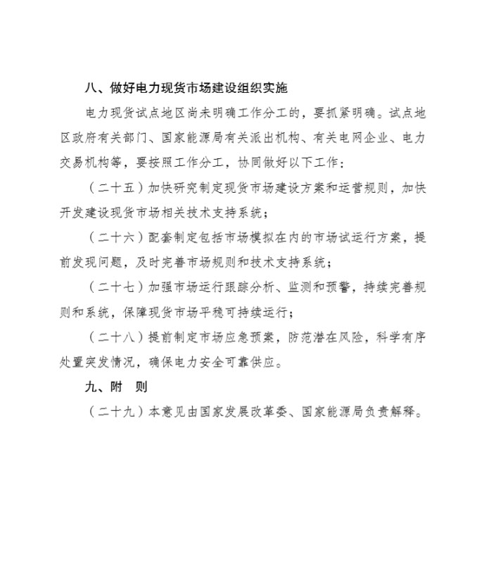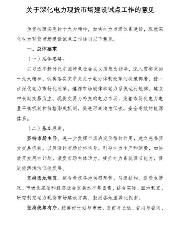 為貫徹落實(shí)黨的十九大精神,加快電力市場(chǎng)體系建設(shè),國(guó)家發(fā)展改革委、國(guó)家能源局組織編制了《關(guān)于深化電力現(xiàn)貨市場(chǎng)建設(shè)試點(diǎn)工作的意見(jiàn)》,現(xiàn)印發(fā)你們,請(qǐng)結(jié)合實(shí)際,推動(dòng)落實(shí)。如遇重大問(wèn)題,請(qǐng)及時(shí)報(bào)告國(guó)家發(fā)展改革委、國(guó)家能源局。