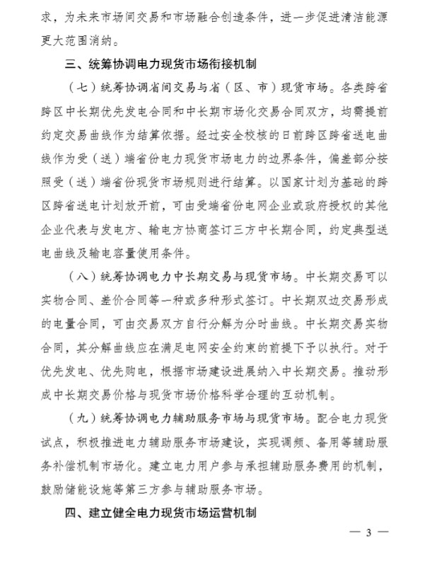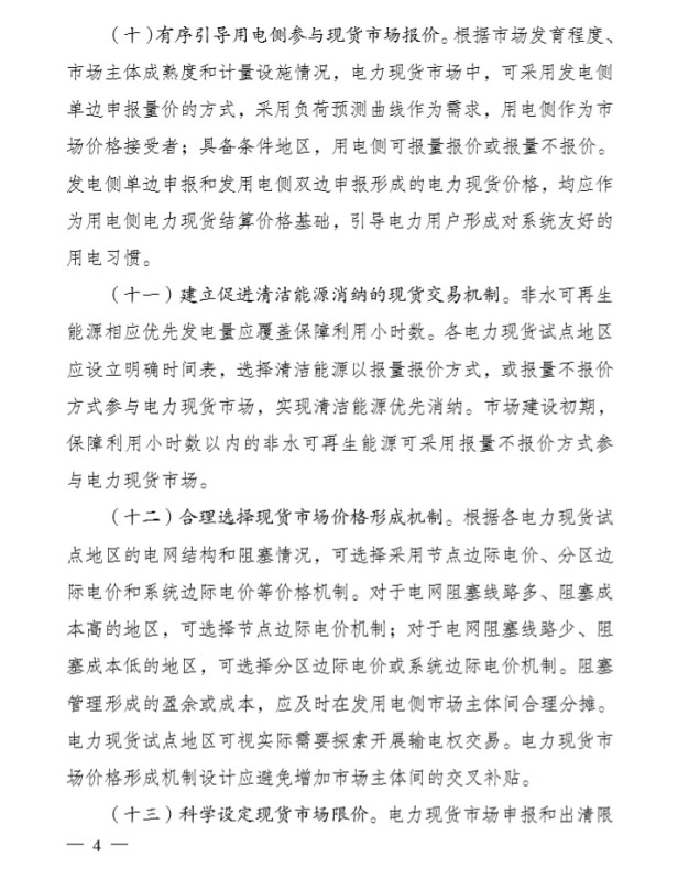 中國(guó)儲(chǔ)能網(wǎng)訊:8月7日,發(fā)改委印發(fā)《關(guān)于深化電力現(xiàn)貨市場(chǎng)建設(shè)試點(diǎn)工作的意見(jiàn)》(以下簡(jiǎn)稱《意見(jiàn)》)。中長(zhǎng)期交易可以實(shí)物合同、差價(jià)合同等一種或多種形式簽訂。中長(zhǎng)期雙邊交易形成的電量合同,可由交易雙方自行分解為分時(shí)曲線。中長(zhǎng)期交易實(shí)物合同,其分解曲線應(yīng)在滿足電網(wǎng)安全約束的前提下予以執(zhí)行。對(duì)于優(yōu)先發(fā)電、優(yōu)先購(gòu)電,根據(jù)市場(chǎng)建設(shè)進(jìn)展納入中長(zhǎng)期交易。推動(dòng)形成中長(zhǎng)期交易價(jià)格與現(xiàn)貨市場(chǎng)價(jià)格科學(xué)合理的互動(dòng)機(jī)制。
