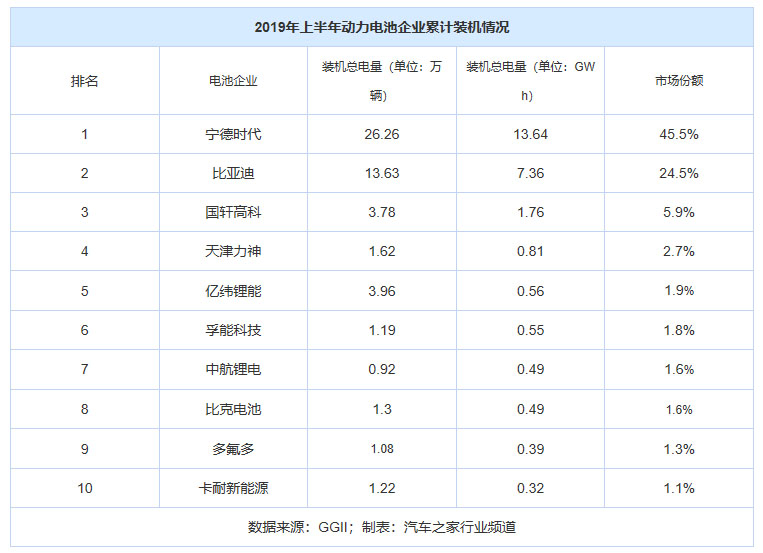 GGII數(shù)據(jù)顯示,2019上半年,動(dòng)力電池裝機(jī)總電量約30.01GWh,其中排名前十的企業(yè)占據(jù)整體88%的市場(chǎng)份額,相比去年提升5個(gè)百分點(diǎn)。而截至2019年6月,國(guó)內(nèi)動(dòng)力電池企業(yè)有60家,這意味著,留給剩下50個(gè)玩家的“椅子”數(shù)量?jī)H剩下12%。