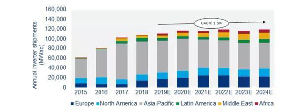 該報(bào)告稱,盡管全球光伏逆變器出貨量在持續(xù)增加,但市場(chǎng)價(jià)值將到2024年間持續(xù)下降。一部分來自中國(guó)531新政的原因,使得價(jià)格壓力在2018年加劇。降低上網(wǎng)電價(jià),并終止對(duì)新建大型大面電站的補(bǔ)貼,531新政對(duì)中國(guó)市場(chǎng)造成了巨大的沖擊,同時(shí),中國(guó)供應(yīng)商開始更積極地進(jìn)軍國(guó)際市場(chǎng),從而加劇了逆變器市場(chǎng)的價(jià)格壓力。
