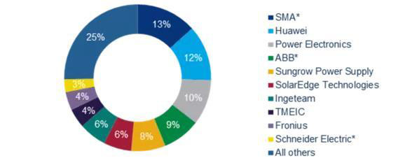 不包括中國(guó)市場(chǎng)的前10名逆變器供應(yīng)商(MWac),2018年