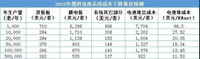 據(jù)美國能源部預(yù)測,如果產(chǎn)量能夠擴大十倍,整車成本就將下降 23%;同時隨著電堆技術(shù)的突破,成本將再下降 23%;兩者疊加帶來的成本下降幅度將超過45%。