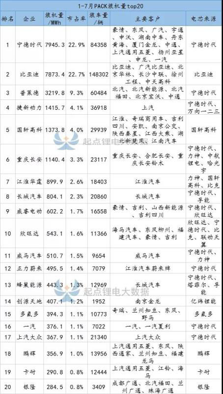 7月PACK裝機(jī)量分析