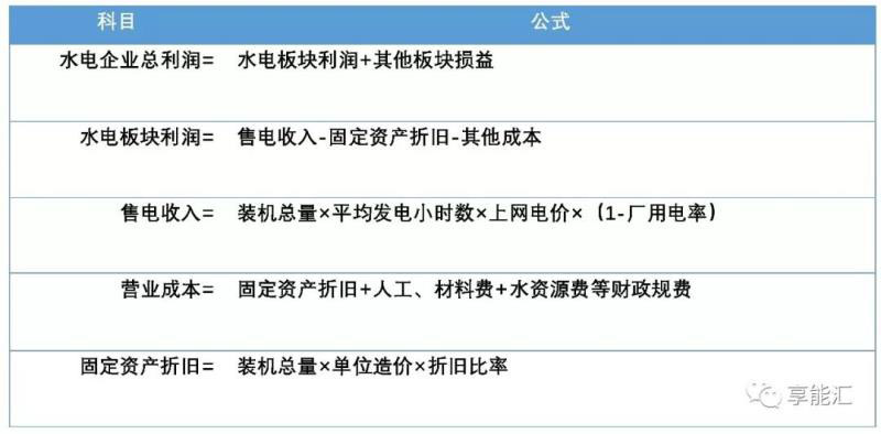 水電板塊利潤(rùn)=裝機(jī)總量×平均發(fā)電小時(shí)數(shù)×上網(wǎng)電價(jià)-固定資產(chǎn)折舊-其他成本。