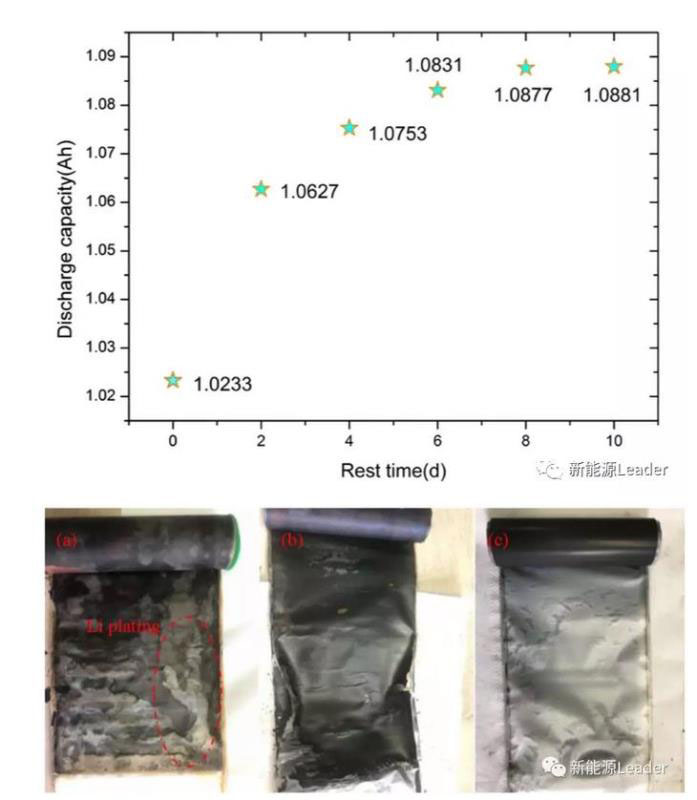 在過充的過程中過量的Li+從正極脫出,遷移的負極表面,嵌入到負極之中,但是當過量的Li遷移的負極表面后,無法繼續(xù)遷入負極的晶體結(jié)構(gòu)之中,因此就會以金屬Li的形式在負極的表面析出,因此過充造成的電池容量的損失是部分可逆的,從下圖的1C過充循環(huán)后電池存儲過程中的容量變化情況可以看到,在存儲的過程中電池的容量逐漸恢復,最終恢復到了1.088Ah左右的,容量恢復率約6.3%,這主要是因為負極表面析出的金屬鋰,在存儲的過程中部分又重新嵌入到石墨負極之中。