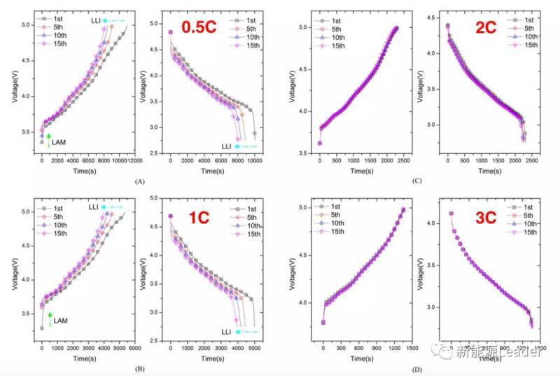 Dongxu Ouyang的研究表明,不同于正常充放電循環(huán),在過充條件下充電倍率越小則對于鋰離子電池的壽命衰降越嚴重,0.5C和1C過充將對鋰離子電池產(chǎn)生嚴重的傷害,而2C和3C過充則不會對鋰離子電池產(chǎn)生嚴重的影響。