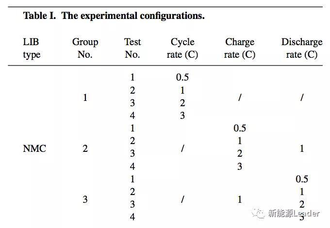 作者在實驗中采用的為三洋的18650電池,電池電壓為4.2V,電池容量為1300mAh,正極為LCO,負極為石墨,實驗中采用的設備如下所示,所有的實驗在20℃的環(huán)境下開展,電池表面分別粘貼3個K型熱電偶,用來測試電池的表面的溫度。實驗安排如下表所示,其中分組1主要測試了不同的循環(huán)倍率的影響,分組2主要測試了不同充電倍率的影響,分組3主要測試了不同放電倍率的影響。