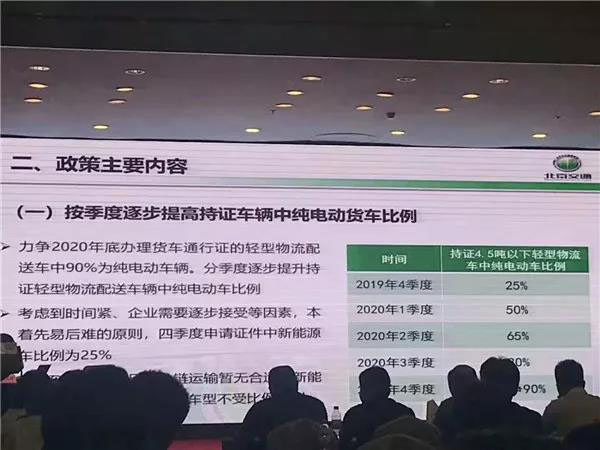 據(jù)悉,該初審實(shí)施細(xì)則指出的工作目標(biāo)為:自2019年四季度起,北京市將通過分季度提升純電動貨車持證比例和實(shí)施差別化通行措施,實(shí)現(xiàn)“到2020年底,除冷鏈運(yùn)輸車輛外,通過辦理貨車通行證方式允許日間通行五環(huán)以內(nèi)道路的4.5噸以下輕型物流車中,純電動貨車比例達(dá)到相關(guān)要求”。
