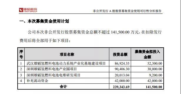 據(jù)公告顯示,在扣除發(fā)行費用后將全部用于以下4個方面:(1)武漢雄韜氫燃料電池動力系統(tǒng)產(chǎn)業(yè)化基地建設項目;(2)深圳雄韜氫燃料電池產(chǎn)業(yè)園項目;(3)深圳雄韜氫燃料電池電堆研發(fā)項目;(4)補充流動資金。