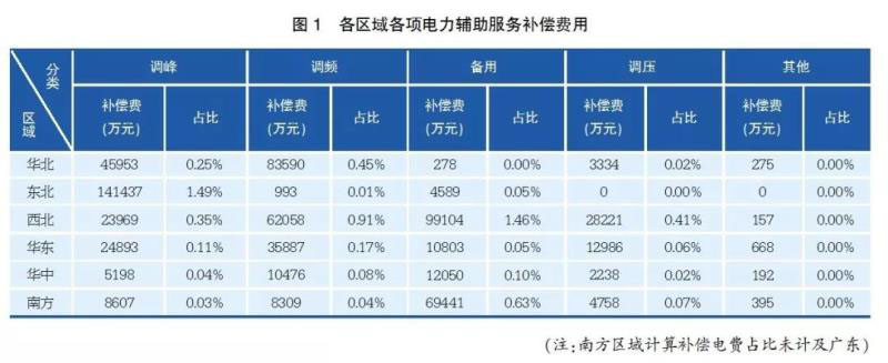 從2018年上半年電力輔助服務(wù)的數(shù)據(jù)看:東北、西北區(qū)域調(diào)峰補償力度最大,西北、華北區(qū)域調(diào)頻(西北區(qū)域調(diào)頻為AGC加一次調(diào)頻,其他區(qū)域調(diào)頻為AGC)補償力度最大,西北、南方區(qū)域備用補償力度最大(如圖1所示)。