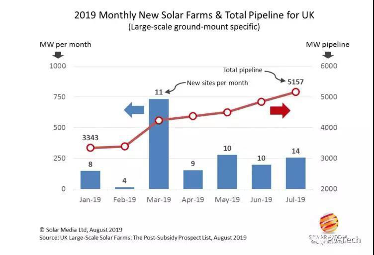 2019年年初的項(xiàng)目為3.34GW。但僅僅在過去的五個月,英國就新增了54個大型太陽能項(xiàng)目,許多原始開發(fā)商(英國首批8.5GW已完工大型太陽能電站的開發(fā)商)已重新回歸到未開發(fā)項(xiàng)目的識別和規(guī)劃工作。