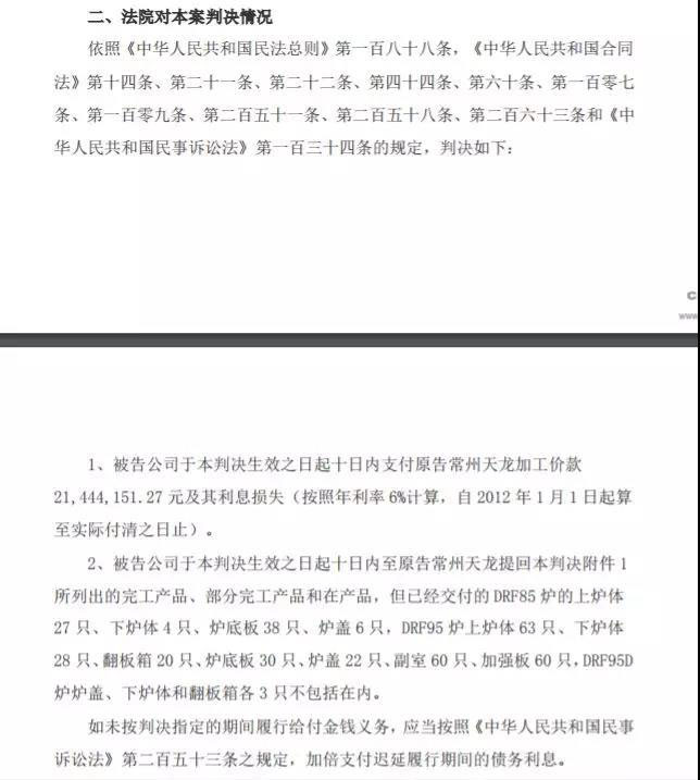 中國(guó)儲(chǔ)能網(wǎng)訊:2019年已過半,陷入泥淖的光伏企業(yè)危機(jī)正愈演愈烈。8月7日,天龍光電發(fā)布公告稱,收到江蘇省常州市新北區(qū)人民法院的《民事判決書》,對(duì)常州市天龍光電設(shè)備有限公司(下稱“常州天龍”)起訴公司加工合同糾紛一案作出判決。天龍光電被判支付給常州天龍工價(jià)款超2144.41萬元,未交付的完工產(chǎn)品、部分完工產(chǎn)品和在產(chǎn)品等,同時(shí)承擔(dān)案件受理費(fèi)等21萬余元。