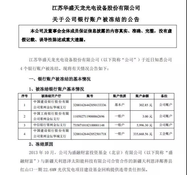 同日,天龍光電因未能償還此前新疆天利恩澤鄯善縣紅山口一期22.6MW光伏發(fā)電項(xiàng)目投資人的相關(guān)款項(xiàng),3個(gè)公司賬戶和1個(gè)工會(huì)賬戶被凍結(jié),賬戶余額累計(jì)超過30萬元。