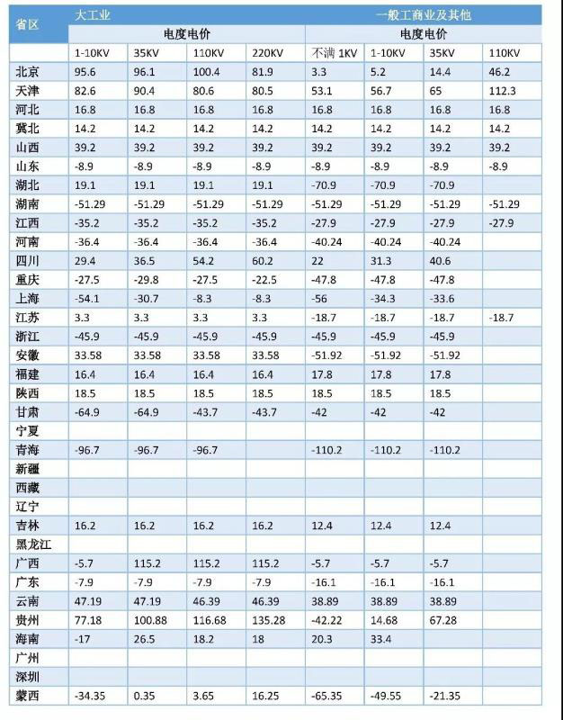 電網(wǎng)企業(yè)收益變化中,一般工商業(yè)及其他用電和大工業(yè)用電收益全部減少,如河北、陜西、山西、北京、天津、云南、山西、四川、福建、吉林。貴州僅不滿1千伏一般工商業(yè)及其他用電收益增加,其他用電收益減少。海南僅1 -10千伏大工業(yè)用電收益增加,其他用電收益減少。部分省區(qū)僅1-10千伏大工業(yè)用電增加,其他大工業(yè)均減少。還存在部分省區(qū)一般工商業(yè)和大工業(yè)用電收益全部增加,如湖南、重慶等。也有省份的收益沒有任何變化。