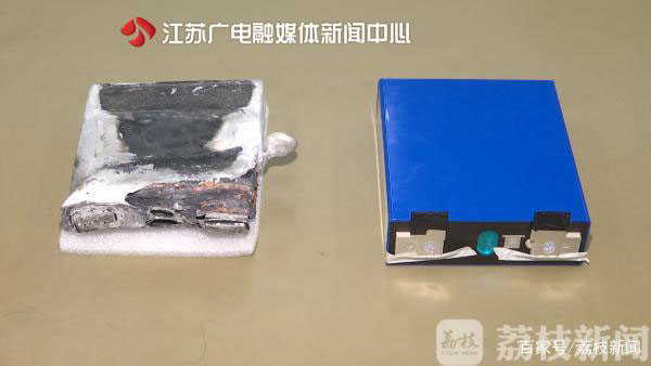 畫面中右側(cè)的藍(lán)色電池是用來(lái)做實(shí)驗(yàn)的3.2伏磷酸鐵鋰電池,大概相當(dāng)于一個(gè)電動(dòng)車用的電池單體的容量。左邊這一塊“白板”是經(jīng)過(guò)燃燒實(shí)驗(yàn)之后的狀態(tài),可以看到安全閥已經(jīng)打開(kāi),呈現(xiàn)出燒糊的狀態(tài)。