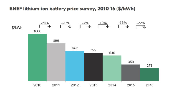 彭博新能源財經(jīng)公司發(fā)布的另一份調(diào)查報告中發(fā)現(xiàn),鋰離子電池的成本也在持續(xù)下降。2010年鋰離子電池的售價高達每千瓦時1,000美元,隨后幾年價格下降超過20%。截至2016年底,鋰離子電池的平均售價每千瓦時下降209美元。